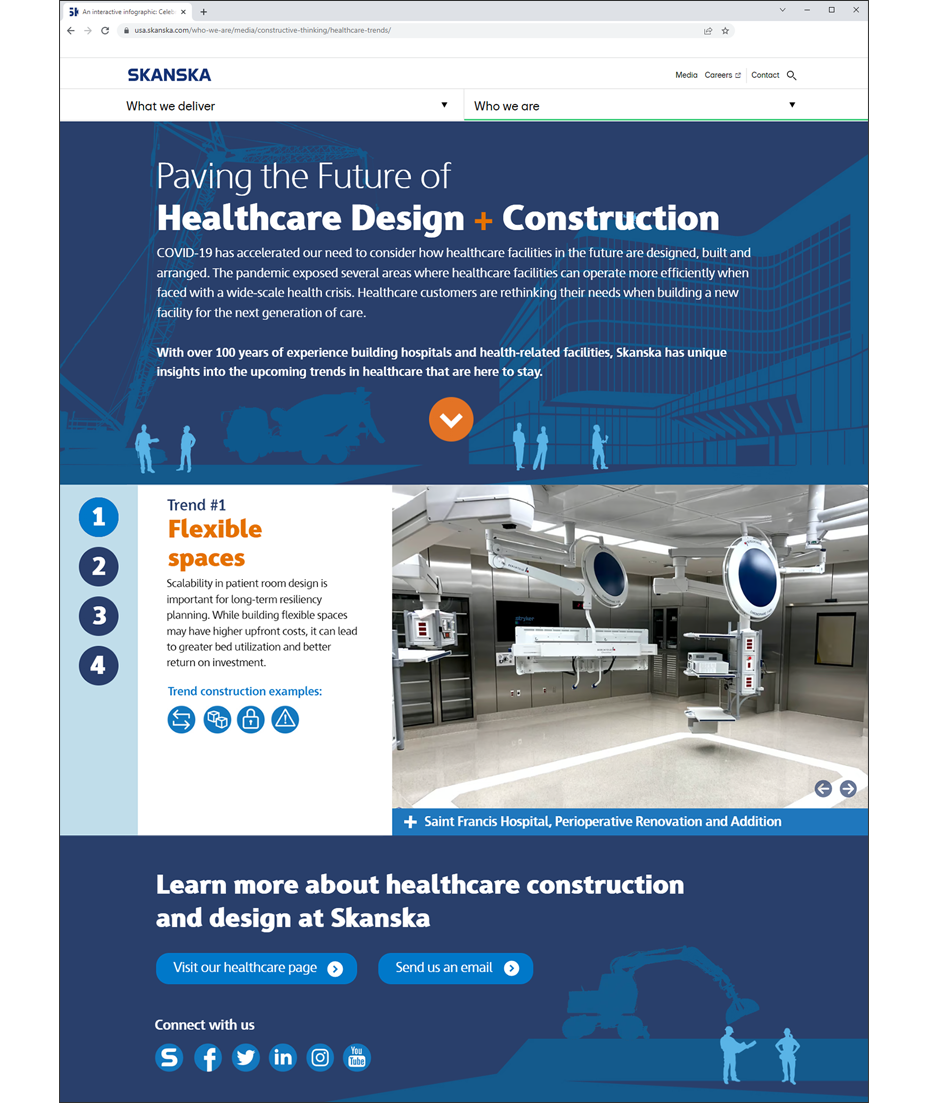 COVID-19 has accelerated our need to consider how healthcare facilities in the future are designed, built and arranged. The pandemic exposed several areas where healthcare facilities can operate more efficiently when faced with a wide-scale health crisis. Healthcare customers are rethinking their needs when building a new facility for the next generation of care. With over 100 years of experience building hospitals and health-related facilities, Skanska has unique insights into the upcoming trends in healthcare that are here to stay.